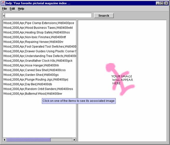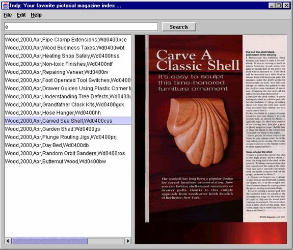 The Indy program acts as a pictorial magazine index. The concept is that a user would use the program to search for all of the articles concerning a particular topic and then pick from a Search Results list to see what the project looks like. Whenever I build a wood project, I usually know generally what I want to create and the furniture styles that appeal to me. Simple, textual-only indexes only help me with half of the selection problem, the searching part. The Indy program does more. It searches and it displays what the search matches look like.